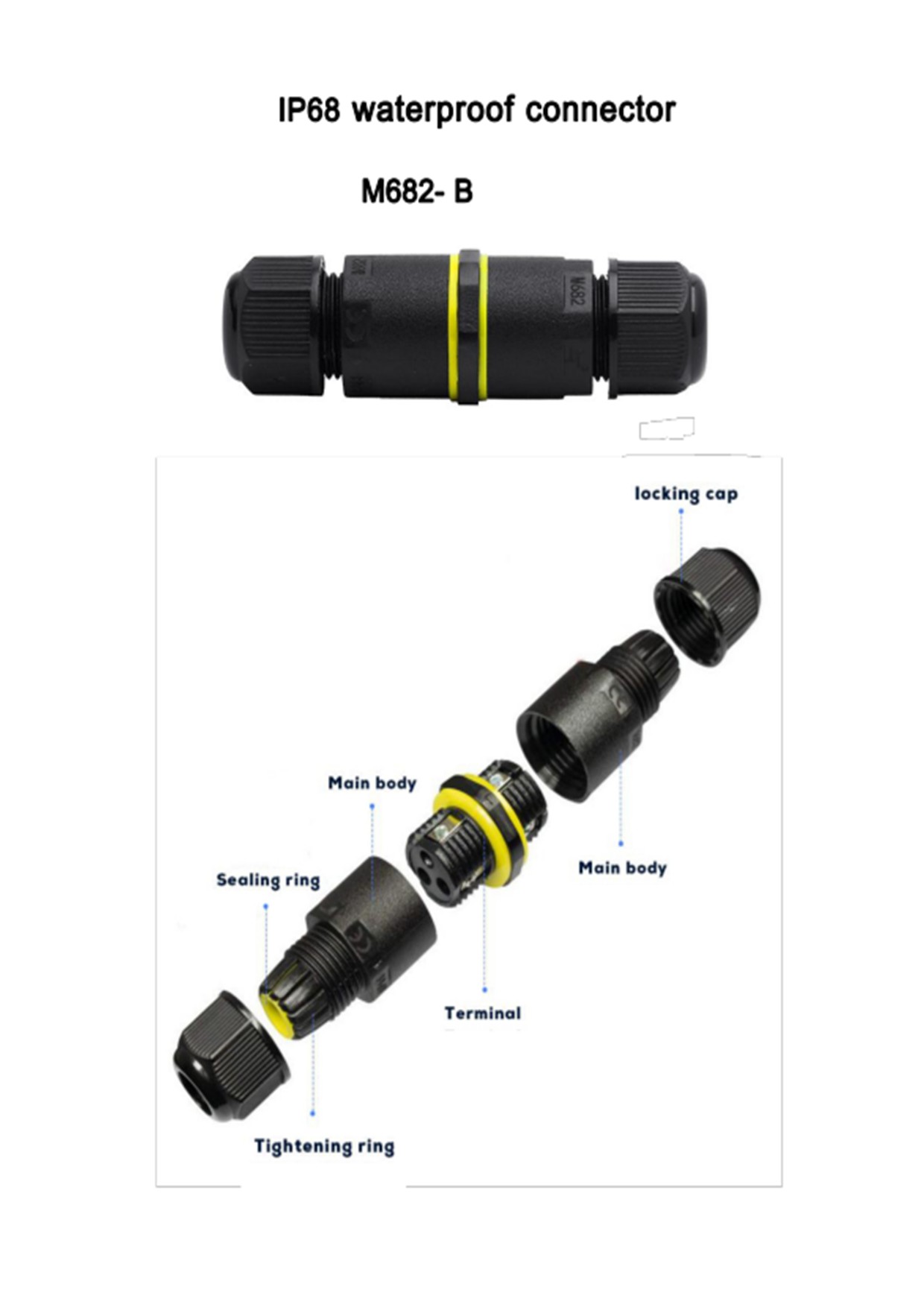 Model: M682-B*2pin*3pin (screw type) IP Code: IP68 (Patented) (with 20 metres water column for 150 hours) Color: Black Connection Type: Screw Ampere / Voltage: 17.5A 450VAC Temperature Range: -40-105°C Wire Section: 0.5 ~ 1.5 mm² Outer Cable Diameter: 3-6.5mm or 5-9mm Certificates: ENEC,CE,CB,UKCA,NSW,ETL,ROHS
