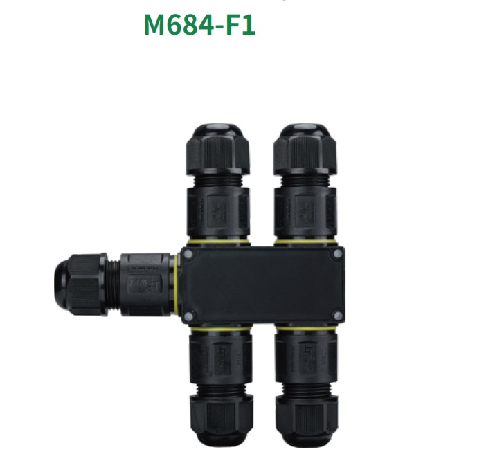 Model: M684-F1*2pin*3pin (screw-less type) IP Code: IP68 (Patented) (with 20 metres water column for 150 hours) Color: Black Connection Type: Screw Ampere / Voltage: 24A 450VAC Temperature Range: -40-105°C Wire Section: 0.5 ~ 2.5 mm² Outer Cable Diameter: 4-8mm or 6-11mm Certificates: ENEC,CE,CB,UKCA,NSW,ETL,ROHS
