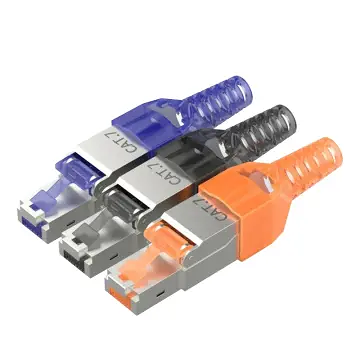 A versatile and durable RJ45 toolless connector plug compatible with CAT7 and CAT6A cables, ideal for high-speed data transmission up to 10Gbps. The toolless design ensures quick and easy installations without the need for special tools, making it perfect for professional or DIY networking projects. Featuring a vibrant blue color for easy identification, robust construction, and gold-plated contacts, this connector ensures stable and secure connections with enhanced signal integrity. Suitable for use in homes, offices, and data centers.