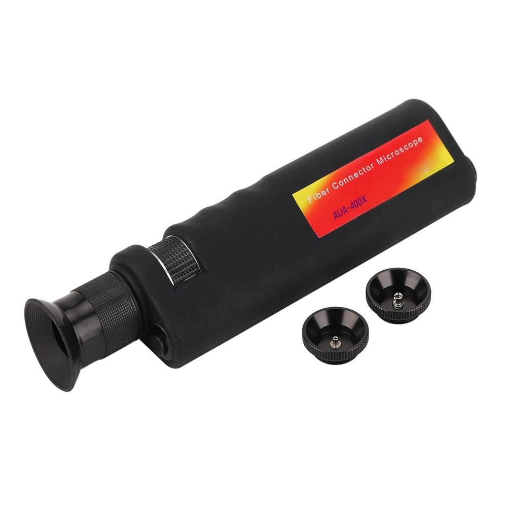 ⚙️ Key Features: 🔹 High Precision 400X Magnification: Delivers crystal-clear viewing of fiber end faces for precise inspection of scratches, dirt, and defects. 🔹 Dual Adapter Support: Includes 2.5 mm and 1.25 mm universal adapters compatible with SC, FC, ST, LC connectors. 🔹 White LED Illumination: Built-in high-intensity LED light source ensures uniform lighting for accurate inspection results. 🔹 Focus Adjustment: Smooth focusing ring allows sharp, high-definition visual clarity for both field and lab use. 🔹 Portable & Durable Design: Compact handheld body with ergonomic anti-slip grip and robust construction for field engineers. 🔹 Safe & Reliable: Optical viewing system eliminates direct laser exposure, ensuring user safety during inspection. 🧰 Technical Specifications: Parameter Specification Magnification 400X Illumination Source White LED Connector Type SC / FC / ST / LC (2.5mm & 1.25mm adapters) Focus Adjustment Manual Power Supply 3× AAA batteries View Type Optical eyepiece (not video) Body Material High-strength ABS & Metal Weight Approx. 350 g Dimensions 190 × 40 × 35 mm 💡 Applications: Fiber optic end-face inspection FTTH, Data Center, and Telecom field testing Connector cleaning verification before installation Optical network maintenance and quality assurance 📦 Package Includes: 1× Fiber Connector Microscope (400X) 1× 2.5 mm Adapter (SC/FC/ST) 1× 1.25 mm Adapter (LC) 1× Protective cap 1× User manual