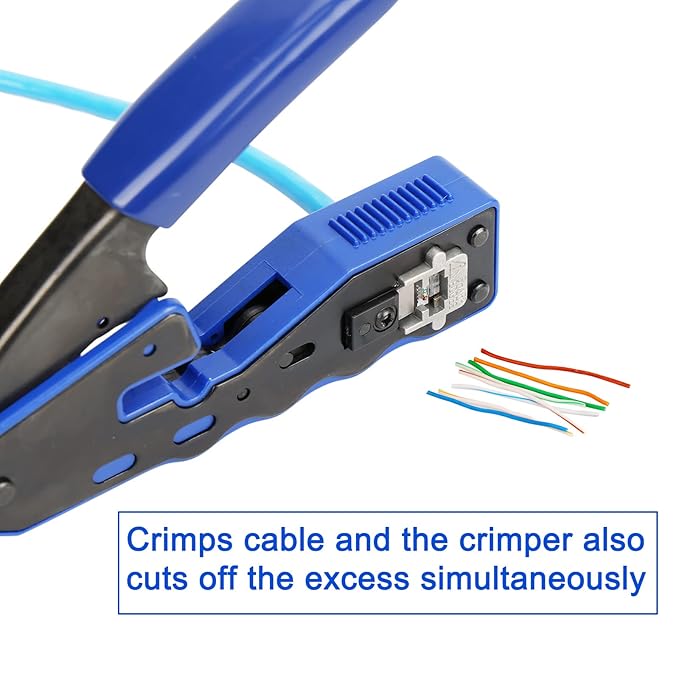 COMMUNETS EZ RJ45/RJ12/RJ11 ADJUSTABLE CRIMPING PLIER Product description EZ Crimp Tool Kit with Network Cable Tester, Premium Quality 50PCS CAT5 CAT5e End-Pass-Through Connectors and a Network Wire Stripper Professional Must-have Wire Terminal Tool RJ45 Crimping Tool provides 360 degrees of connector support during the crimping cycle, as it cuts, strips and terminates RJ11/12 and RJ45 extended copper wires with a precision die head. LAN/Ethernet Cable Tester For cables with RJ45/RJ11/RJ12 Connector (battery/charger not included). The LED lights will flash in rotation if all the wires are properly connected, otherwise the corresponding light will not flash. Ideal for Pass-Through and legacy connectors Fast and reliable ez crimping tool that crimps RJ45 modular plug for CCTV, Security, media and data communication by upholding a clean cut trims on RJ45/RJ11/12 end-pass-through 8 conductor. Multifunctional Tool Full Compatible with Ethernet and phone cables, this all-in-one tool tackles crimping, stripping and cutting of all RJ45 CAT5 CAT5E, CAT6 (including shielded) and RJ11/12 connectors (not AMP). Long-lasting durability and Easy of use Hardened Steel Contruction is durable and delivers more torque during the crimping cycle, die head assembly provides 360 degrees of connector support for terminating modular plugs on stranded or solid cable Replaceable conductor cutter Easy to replace the 8 pin blade that is responsible for a clean cut during pass-through connector termination. Packing included 1 x EZ Crimp Tool(Blue) 1 x Network Cable Tester ( If it does not work, please let us know freely.) 1 x Network Wire Stripper(Yellow) 50PCS x RJ45 Pass Through Connectors
