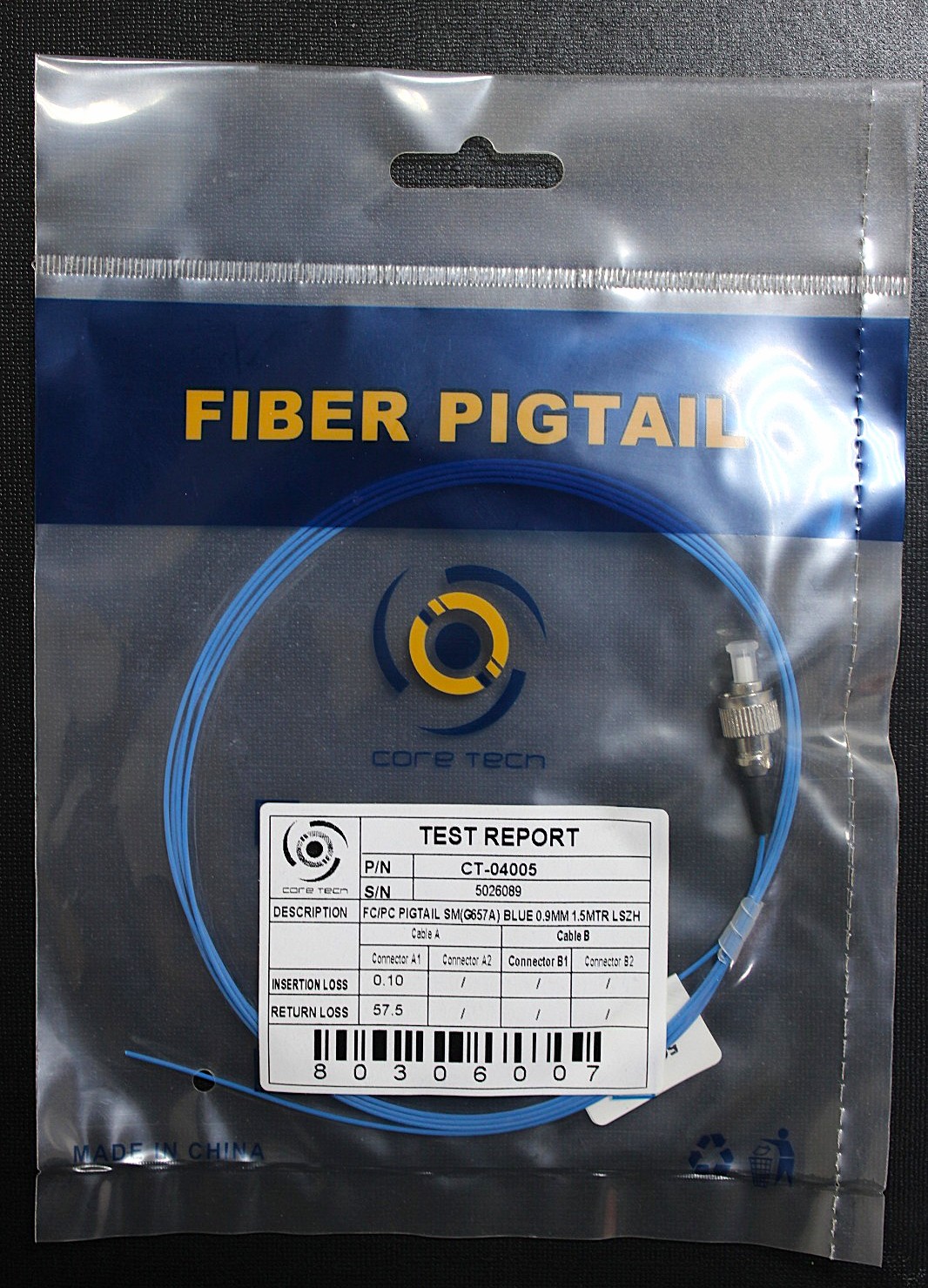 CoreTech FC/PC Pigtail (CT-04005) is a high-performance single-mode fiber optic component designed for stable connectivity and minimal signal loss in telecommunications and data center environments. Technical Specifications According to the product listings on Communets and Core-Tech, the device features the following specifications: Connector Type: FC/PC (Ferrule Connector/Physical Contact) with a threaded, screw-type fitment for secure connections. Fiber Standard: Single Mode G.657.A, a bend-insensitive fiber that allows for tighter routing in confined spaces without signal degradation. Cable Diameter: 0.9mm tight-buffered fiber, which is a standard size for internal splicing within distribution boxes. Cable Length: 1.5 meters. Jacket Material: LSZH (Low Smoke Zero Halogen), which reduces the amount of toxic and corrosive gas emitted during combustion. Color Identification: Blue jacket, typically used for easy identification within multi-fiber bundles. Key Performance Features Experts and technical documentation highlight several advantages for this specific fiber type: Bend Sensitivity: The G.657.A fiber is fully compliant with G.652.D standards but offers improved resistance to macro-bending, making it ideal for high-speed, long-distance communication systems where space is limited. Optical Integrity: Designed for low insertion loss (typically ≤0.10 dB) and high return loss (typically ≥57.5 dB for PC polish), ensuring reliable data transmission. Durability: The connector is typically rated for up to 500 matings without performance degradation. Applications: Commonly used in Fiber-to-the-Home (FTTH), local area networks (LAN), and as a splicing point in optical distribution frames