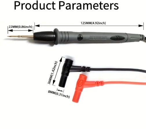 These are electrical testing probes used with a digital or analog multimeter to measure electrical parameters such as voltage, current, resistance, and continuity. Key Features: Color-coded leads: Red (positive) and black (negative) for easy polarity identification. Sharp metal tips: Allow accurate contact with small or recessed test points. Insulated handles: Provide user safety against electric shock. Flexible wires: Ensure easy maneuvering and connection to devices under test. Standard banana plug connectors: Compatible with most multimeter input ports. Typical Use: Ideal for electricians, technicians, and hobbyists for diagnosing circuits, testing batteries, components, and other electrical systems.