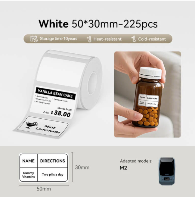 • Compatible - Only for NIIMBOT M2/M3 label printer. One roll paper replacement thermal transfer labels 1.97'' x 1.18''(50x30mm). • Easy to use - The Peel-and-stick labels with strong self-adhesive backing. Contains anti-counterfeiting chips and can be intelligently identified by NIIMBOT M2 label printer. • 8-10 Years Long-Lasting - PET material, waterproof, oil-proof, tearproof and leave no trace, BPA-free, high and low-temperature resistance. Perfect for indoor and outdoor use, even in harsh conditions, and long storage time. • Widely Used - M2 replacement labels are used for business, or industrial applications, such as office organization, cables, laboratory, plants, jewelry, and more. Labels make your life and work more efficient, organized and tidy. • Notice - The sticker label inside of the roll contains the printed sensor chip, used to identify label paper size, Please do not tear it, otherwise, it will affect the printing effect.