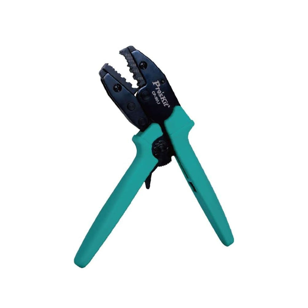 Key Features: Ratchet Mechanism: Force-saving and accurate crimping with consistent results. Precise Die Set: Made of AISI 4140 steel, ensuring durability and precision. Heavy-Duty Construction: High-quality carbon steel frame with black oxide finish for rust resistance. Adjustable Pressure: Ratchet design with fine pressure adjustment for customized crimping force. Ergonomic Handle: Non-slip TPR grip provides comfort and reduces hand fatigue during extended use. Product Description: The Pro’sKit CP-301U Ratchet Crimping Tool is a professional-grade solution for accurate and reliable crimping. Engineered with AISI 4140 precision die steel and a carbon steel frame, this crimping tool offers exceptional strength and long service life. Its ratchet mechanism with adjustable pressure ensures consistent results while saving effort. Designed with ergonomic non-slip handles, it delivers comfort and control for electricians, technicians, and DIY users alike. Technical Specifications: Model: CP-301U Material: AISI 4140 Die Steel + Carbon Steel Frame Finish: Black Oxide Coating Mechanism: Ratchet with Adjustable Pressure Handle: Ergonomic Non-Slip TPR Grip Application: Electrical wiring, terminals, connectors What’s in the Box: 1 × Pro’sKit CP-301U Ratchet Crimping Tool Ideal For: Professional electricians Telecom and networking technicians Automotive wiring jobs DIY electrical projects