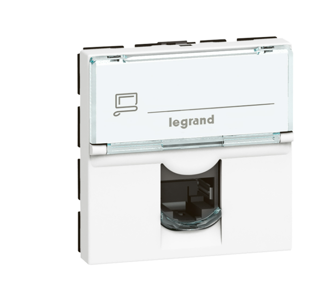 Legrand Mosaic™ RJ45 Data Socket - Category 6A UTP - 2 Modules - White (Ref. 076574) Product Overview The Legrand Mosaic™ Cat. 6A UTP RJ45 socket is a high-performance, compact mechanism designed for modern, high-speed network installations. It ensures reliable 10 Gigabit Ethernet connectivity within the highly versatile Legrand Mosaic™ modular wiring system, making it perfect for both residential and commercial structured cabling. Key Features • 10 Gigabit Performance: Supports Category 6A (Cat. 6A) performance, enabling a data transmission rate of up to 10 Gbit/s (10 Gigabit Ethernet). • UTP (Unshielded Twisted Pair): Designed for use with Unshielded Twisted Pair (U/UTP) cables in environments with low electromagnetic interference. • Mosaic™ Modularity: A 2-module mechanism compatible with all Legrand Mosaic™ supports, frames, and plates for seamless integration into flush-mounted boxes, surface-mounted systems, trunking, and floor boxes. • Toolless, Fast Connection: Features the LCS² connector with quick, toolless connection (integrated crimping), accepting AWG 22 single-core up to AWG 26, and multi-core cables. • PoE Support: Fully supports high-capacity Power over Ethernet (PoE) applications, including Types 1 to 4, up to 90W. • Dual Color Coding: Contacts are marked with dual color codes and are compatible with both TIA/EIA wiring schemes: T 568 A and T 568 B. • Protection: Equipped with a transparent protective dust cover to shield the connector when not in use.