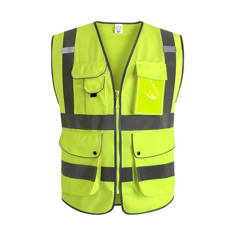 Bright yellow safety jacket with reflective stripes and multiple pockets for added convenience. Designed for visibility and comfort in high-risk environments.