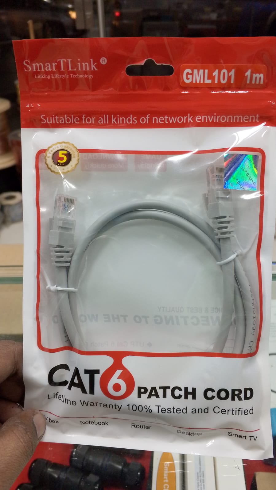 SMART LINK CAT-6 Patch Cable – 1 Meter The SMART LINK CAT-6 Patch Cable – 1 Meter is a high-quality, performance-driven Ethernet cable designed for seamless data connectivity in home, office, and commercial network environments. This short-length patch cable is ideal for close-proximity connections such as linking desktop computers, switches, routers, access points, and other networking devices. Built to meet TIA/EIA-568-C.2 Category 6 standards, the cable supports Gigabit Ethernet speeds and high-frequency bandwidth up to 250 MHz, ensuring reliable performance with minimal signal interference or crosstalk. Key Features: Length: 1 Meter – Ideal for short, tidy network runs Category: CAT-6 – Compliant with TIA/EIA-568-C.2 standard Performance: Supports up to 1 Gbps (Gigabit Ethernet) Bandwidth: Up to 250 MHz Construction: UTP (Unshielded Twisted Pair), 24 AWG copper conductors Connectors: RJ45 male-to-male with 50-micron gold-plated contacts Jacket Material: Flexible PVC with molded strain relief boots Plug-and-Play: Pre-terminated and ready for immediate use Color Options: Typically available in Grey, Blue, or Black