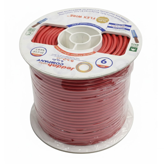 6MM² FLEX WIRE – RED (Flexible Copper Cable) – 100 Yards Roll Product Description High-quality 6mm² flexible copper electrical wire suitable for residential, commercial, automotive, and industrial applications. Designed for maximum conductivity, heat resistance, and long-lasting performance. Ideal for power supply, battery connections, inverters, solar systems, and general electrical installations. ________________________________________ Key Features • Conductor Size: 6mm² (Standard flexible copper conductor) • Color: Red • Length: 100 Yards (Approx. 91–100 meters) • Material: 99.9% Pure stranded copper • Insulation: PVC / Flame-retardant material • Flexibility: High–flex, easy to bend and route • Rated Voltage: 450/750V • Temperature Rating: −20°C to +70°C • Durability: Oil-resistant, heat-resistant, abrasion-resistant ________________________________________ Applications • Automotive wiring • Battery & inverter connections • Solar power systems • AC/DC power supply lines • Home electrical installations • Industrial machinery • Control panels & distribution boxes ________________________________________ Specification Table Specification Details Conductor Size 6mm² Conductor Type Multi-strand pure copper Roll Length 100 yards Insulation PVC / FR-PVC Color Red Voltage Rating 450/750V Temperature Range −20°C to +70°C Standard Compliance IEC / ASTM equivalent