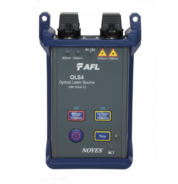 The AFL OLS4-10-0900PR is a rugged, integrated, two-port optical light source designed for comprehensive insertion loss measurements on both Multimode and Single-mode fiber optic links when paired with a compatible Optical Power Meter (OPM).1 This quad-wavelength source provides the essential test signals required for certifying fiber links to TIA/EIA standards, making it an indispensable tool for technicians working on LAN, Telco, CATV, and FTTx networks.2 Key Features & Benefits • Quad-Wavelength Testing: Combines both LED (Multimode) and LASER (Single-mode) outputs in one handheld unit.3 o Multimode (MM) Output: 850 nm & 1300 nm LED (from one port).4 o Single-mode (SM) Output: 1310 nm & 1550 nm LASER (from a second port).5 • SC Connector: Comes standard with an SC connector port for both MM and SM outputs. Field-swappable adapters (FC, ST, LC) are also available separately for maximum flexibility.6 • Wave ID® Technology: Drastically reduces test time and errors by simultaneously transmitting multiple wavelengths (MM and SM).7 When paired with an AFL Wave ID Power Meter, the meter automatically detects the wavelengths and stores the corresponding loss values.8 • Rugged Field Design: Built to withstand the harsh outside plant environment with a protective rubber boot, splash-resistant controls, and ability to withstand a one-meter drop test.9 • Stabilized Outputs: Ensures highly accurate and repeatable test results over long periods, meeting current TIA/EIA requirements.10 • Long Battery Life: Operates on globally available 2x AA batteries for long-lasting field performance.11 • Tone Output: Single-mode port includes a 2 kHz Tone for use with an Optical Fiber Identifier (OFI) for non-intrusive fiber tracing and identification.12 • High Output Stability: Guaranteed output stability for reliable measurements:13 o MM Port: $\pm0.1\text{ dB}$ over 8 hours. o SM Port: $\pm0.1\text{ dB}$ over 8 hours ($\pm0.05\text{ dB}$ over 1 hour).