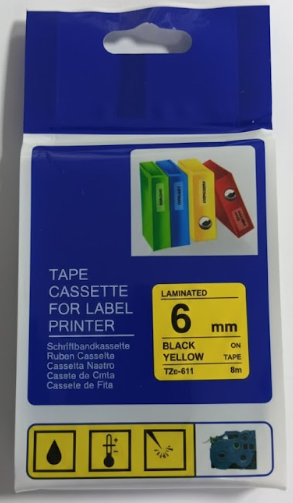 BROTHER COMPATIBLE 6 MM BLACK ON YELLOW LABEL TAPE FOR BROTHER LABEL PRINTERS Tze-611
