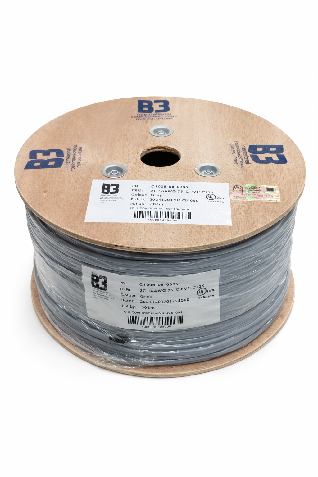 B3 C1008 Cable – General Description • Part Number / Type: C1008 (B3 International / compatible with Belden 5200UE series) • Conductor: 2 cores of 16 AWG flexible bare copper • Shielding: Un-shielded — meaning it does not have an overall screen on the pair • Insulation: Polyolefin around each conductor • Sheath / Jacket: Flame-retardant PVC (polyvinyl chloride), typically grey • Application: Designed for audio, control, instrumentation, building management systems (BMS) and similar low-voltage signal uses • Standard Length: Usually in 305 m rolls (standard put-up) • Voltage Rating: Usually around 300 V typical for control and instrument cabling (as shown in compatible catalogs) In summary: C1008 is a 2-core, 16AWG unshielded B3-series PVC-sheath cable used for control and instrumentation wiring, especially where shielding is not required.