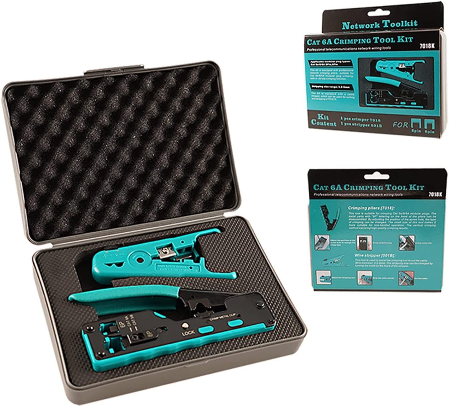 COMMUNETS NETWORK CRIMPING KIT • Portable Case Design - It carried with a portable case , we can keep this professional rj45 pass through Ethernet crimper, a wire stripper in this case well. Easy to carry everywhere. • Cat7/Cat6/Cat6A/Cat5e/Cat5 Pass Through RJ45 Ethernet Crimper Design - Professional RJ45 Pass Through Ethernet Crimper With Pass Through Design Can Crimp RJ45 Cat7 Cat6A Cat6 Cat5e Cat5 Shielded and unshielded Pass Through Connectors; It can crimp 23 to 26 AWG round network cable. It is also compatible with rj12 connectors. More easy to operate; Reduces working time. • Cat6A/Cat7 Dovetail Clip Crimper Design - Great for Crimping Cat6A/Cat7 Shielded or unshielded Standard Connectors or pass through connectors with Dovetail clamping, More Easier: When we crimping cat6A/cat7 shielded standard connectors or pass through connectors, we can use professional dovetail clamping port to better fix the connectors, so that the network cable is not easy to fall off. • Widely Application - it support wide kinds of cables: Ideal for Cat7/Cat6A/Cat6/Cat5e/Cat5 Shielded (Stp) and Unshielded (Utp) Cables. Designed for use with network cable test, telephone lines test. We can use it at home, office, lab, dormitory, repair store and in daily life. • Wire Stripper Stripping Cable Quickly - It can strip round cables and flat wire to avoid damaging internal wires quickly; Easy to operate and strip the network cable Through Nut for Adjusting Blade Depth.
