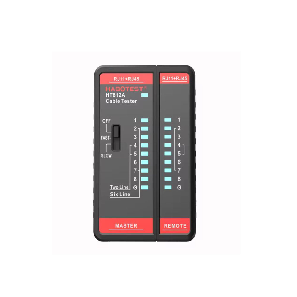 The HABOTEST HT812A Cable Tester is an essential tool for anyone working with telephone or Ethernet networks. Designed to test RJ11 and RJ45 cables, it helps quickly identify wiring errors such as opens, shorts, miswires, and cross connections. Its intuitive LED indicator panel clearly displays the continuity of each pin, while the Fast/Slow scan switch gives you control over the testing pace. The detachable remote unit enables convenient one-person operation — perfect for home installations, office network setups, and professional maintenance tasks. Built with durable materials and powered by a 9V battery, the HT812A ensures reliability and efficiency in every job. 💡 Key Product Features (Bullet Points) ✅ Dual Interface Compatibility: Supports both RJ45 (LAN/Ethernet) and RJ11 (telephone) cables for versatile testing across multiple connection types. 🔍 LED Indicator Display: Each wire pair (1–8 + G) is clearly displayed through LED lights, helping you quickly identify open, short, or crossed connections. ⚡ Fast & Slow Scan Modes: Adjustable test speed switch lets you choose between FAST and SLOW scanning for precise diagnostics and easy line tracking. 📦 Detachable Remote Unit: Allows one-person cable testing even when cables are installed in different locations — ideal for field engineers and installers. 🔋 Portable & Reliable Design: Compact, lightweight body with durable ABS housing, powered by a standard 9V battery (not included) for convenience and mobility. 📦 Package Includes 1 × Master unit 1 × Remote unit 1 × User manual ⚙️ Technical Details Specification Detail Brand HABOTEST Model HT812A Connectors RJ11 + RJ45 Power Supply 9V Battery (not included) Material ABS Plastic Modes Fast / Slow LED Indicators 1–8 + Ground Dimensions Approx. 105 × 68 × 28 mm Weight ~140 g 🔧 Best For Network engineers IT technicians Data center maintenance LAN & telephone cable installers DIY home networking