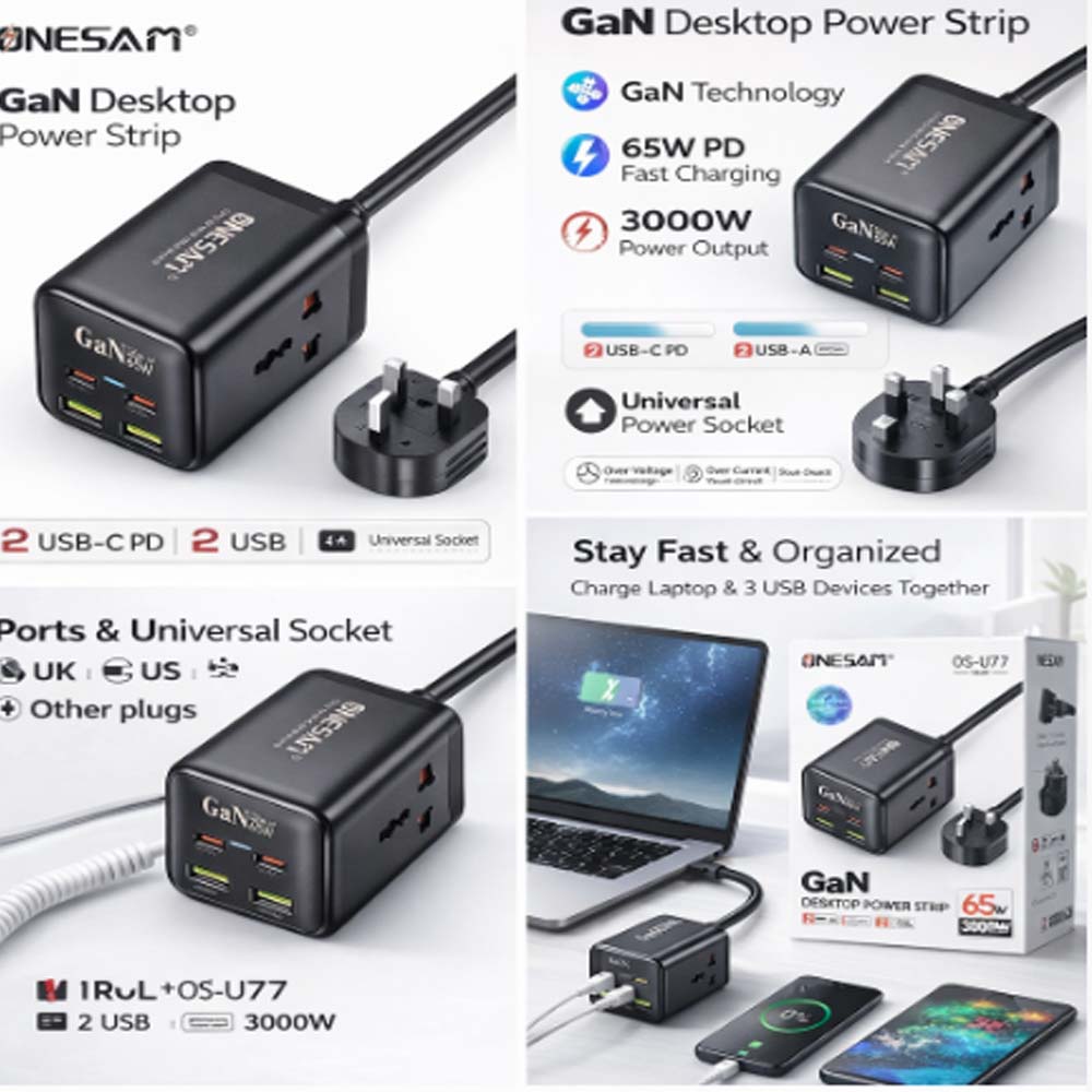 Product Description The ONESAM OS-U77 GaN Desktop Power Strip is a compact, high-performance charging solution designed for modern offices, homes, and workstations. Powered by GaN (Gallium Nitride) technology, it delivers efficient fast charging with 65W USB-C PD output and supports a total load of up to 3000W, making it ideal for laptops, smartphones, tablets, and multiple electronic devices simultaneously. ________________________________________ Key Features • ⚡ GaN Technology – Faster charging, less heat, compact size • 🔌 65W USB-C Power Delivery (PD) – Ideal for laptops & fast-charge devices • 🔋 Multiple USB Outputs – Charge several devices at once • 🧩 Universal Power Socket – Supports various plug types • 🏠 Desktop Power Strip Design – Clean & organized workspace • 🛡️ Built-in Safety Protection – Over-voltage, over-current & short-circuit protection • 🔥 High Load Capacity – Supports up to 3000W total power ________________________________________ Technical Specifications • Brand: ONESAM • Model: OS-U77 • Technology: GaN (Gallium Nitride) • USB-C Output: Up to 65W (PD) • USB Ports: 2 × USB + 2 × USB-C PD • Power Socket: Universal socket • Max Load: 3000W • Input Plug: UK-Type (as shown) • Color: Black • Usage: Desktop / Table-top ________________________________________ Ideal For • Office desks & workstations • Home offices & study tables • Laptops, smartphones, tablets • IT desks & control rooms • Travel desks & compact setups ________________________________________ What’s in the Box • 1 × ONESAM OS-U77 GaN Desktop Power Strip • 1 × Integrated Power Cable