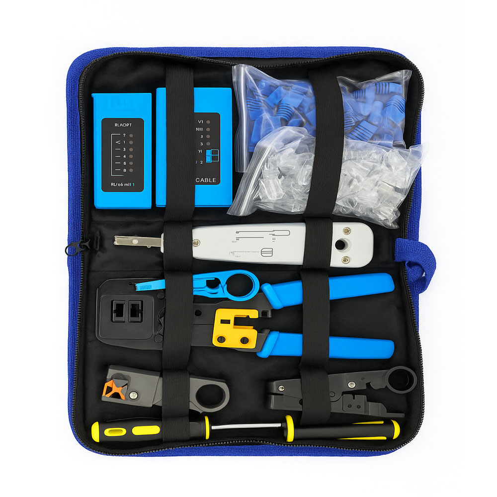 π¦ Product Description This complete Network Cable Tool Kit is designed for professionals and home users who need to create, test, and maintain Ethernet or telephone connections. It includes all the essential tools for cutting, crimping, stripping, and testing network cables β neatly organized in a durable zippered carrying case for portability and convenience. Whether youβre installing CAT5e/CAT6 cables, setting up a network cabinet, or repairing LAN lines, this kit offers reliable performance and long-lasting durability. β Key Features All-in-One Networking Solution: Includes cable tester, crimping tool, punch-down tool, strippers, screwdriver, RJ45 connectors, and protective boots. Cable Tester (RJ45/RJ11): Quickly tests continuity, wiring sequence, and cable integrity with LED indicators. Durable Crimping Tool: High-precision crimper supports RJ45, RJ11, and RJ12 connectors with built-in cutter and stripper. Punch Down Tool: Ideal for inserting wires into keystone jacks, patch panels, and distribution frames. Easy Cable Preparation: Multiple stripping tools for UTP/STP and coaxial cables ensure clean and accurate wire stripping. Convenient Carry Case: Compact and organized zippered pouch keeps tools protected and ready for use anywhere. Essential Accessories Included: Comes with a pack of RJ45 connectors and blue strain relief boots. π© Package Includes RJ45/RJ11 Cable Tester Multi-Function Crimping Tool Punch Down Tool UTP Cable Stripper (Blue) Coaxial Cable Stripper (Grey) Wire Cutter/Stripper (Yellow-Blue) Flat-Head Screwdriver 50 Γ RJ45 Connectors 50 Γ Strain Relief Boots (Blue) Zippered Carry Case