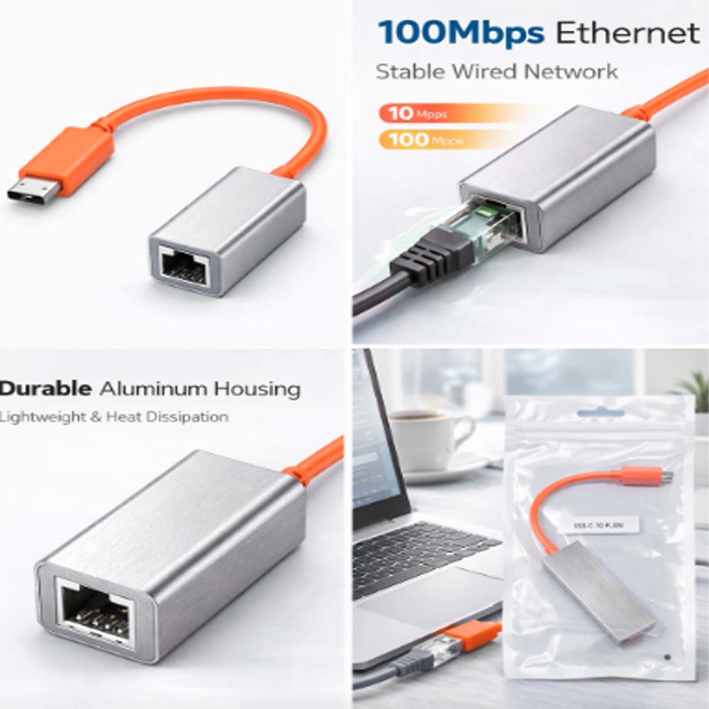 Product Description The USB-C to RJ45 Ethernet Adapter (100Mbps) provides a stable and reliable wired internet connection for USB-C devices that do not have a built-in LAN port. Designed with a durable aluminum housing and a short flexible cable, this adapter is ideal for offices, travel, classrooms, and IT use where consistent network performance is required. Simply plug it into your USB-C port and connect an Ethernet cable to enjoy smooth browsing, video calls, file transfers, and network access. ________________________________________ Key Features • 🌐 Wired Ethernet Connection – More stable than Wi-Fi • ⚡ Supports 10/100 Mbps LAN Speed • 🔌 USB-C Interface – Compatible with modern laptops & devices • 🧱 Aluminum Alloy Body – Better heat dissipation & durability • 🧳 Compact & Lightweight – Easy to carry for travel • 🔄 Plug & Play – No driver required for most systems ________________________________________ Technical Specifications • Input Interface: USB Type-C • Output Interface: RJ45 Ethernet • Network Speed: 10 / 100 Mbps • Material: Aluminum housing • Cable Type: Short flexible cable • Color: Silver (adapter) + Orange cable • Installation: Plug & Play ________________________________________ Compatibility • Devices: o USB-C laptops o Tablets with USB-C o USB-C enabled PCs • Operating Systems: o Windows o macOS o Linux ________________________________________ Ideal For • Office & corporate use • Work-from-home setups • IT & network troubleshooting • Online meetings & classes • Travel & portable networking ________________________________________ What’s in the Box • 1 × USB-C to RJ45 Ethernet Adapter (100Mbps) ________________________________________ Why Choose This Adapter? ✔ Stable wired network connection ✔ Strong aluminum build ✔ Easy to use – no setup required ✔ Perfect backup for Wi-Fi