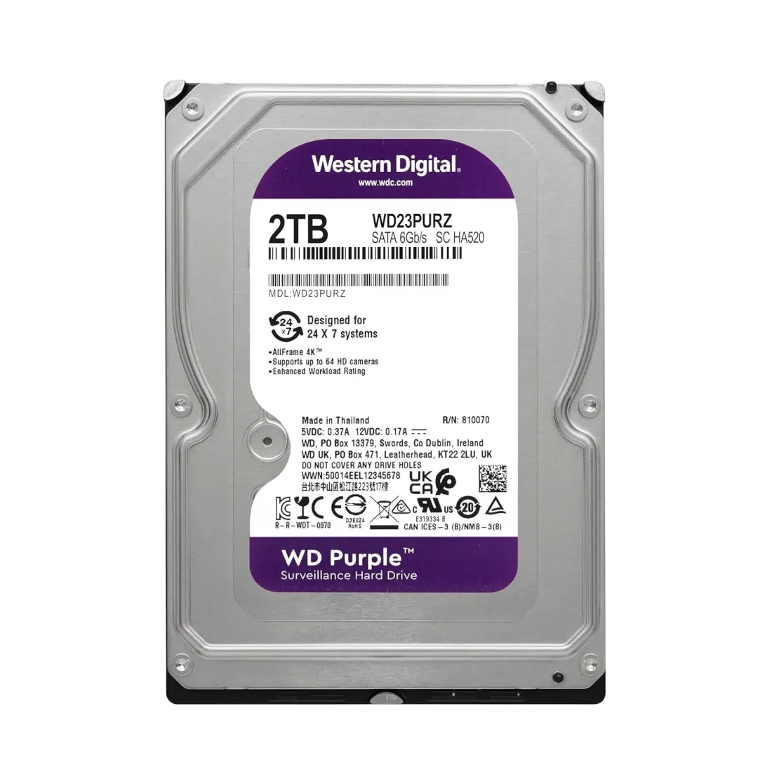 Key Specifications Attribute Detail • Capacity • 2 TB (2000 GB) • Form Factor • 3.5-inch HDD • Interface • SATA 6 Gb/s (SATA 3.1) • Spindle Speed • 5400 RPM • Cache • 64 MB (some sources list 256 MB) • Recording Technology • CMR (Conventional Magnetic Recording) • Workload Rating • Up to 180 TB/year • Camera Support • Supports up to 64 HD cameras • Technology • Features WD AllFrame technology for optimized surveillance workloads Key Features • 24/7 Operation: Engineered specifically to withstand the demands of constant writing and higher temperatures in always-on surveillance environments. • Optimized Performance: WD AllFrame technology helps reduce errors, pixelation, and video interruptions typical in DVR/NVR systems, ensuring quality video playback. • Reliability: Includes tarnish-resistant components (for capacities 3TB and higher, though the 2TB model also has high reliability ratings) and is backed by a 3-year limited warranty. • Compatibility: Designed to be compatible with a wide range of NVRs, DVRs, enclosures, and chipsets. These technical specifications detail the capacity, interface, and performance features of the WD Purple 2TB surveillance hard drive: